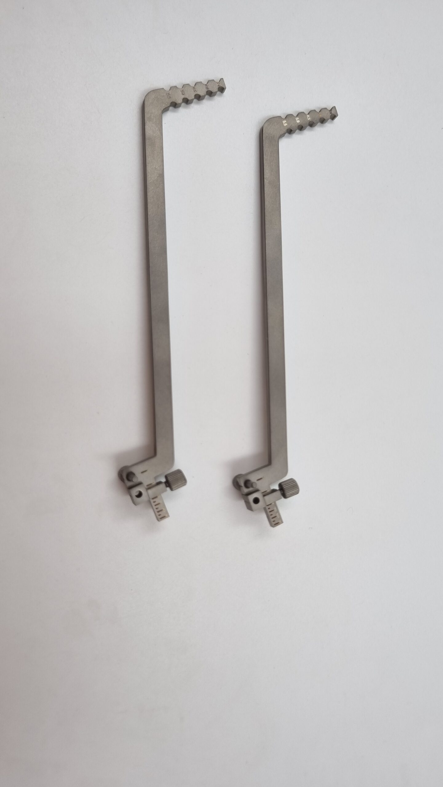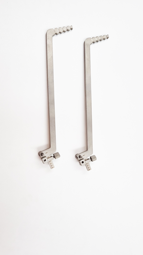 Useful in finding the implant position when adjacent implant placement hole has already been drilled. Consists of holes A & B. Hole A is used to place the guide pin and hole B is used to mark or to directly drill implant hole, the distance between hole A and hole B is adjacent implant placements. Once the first implant placement hole is drilled, the instrument can be used to accurately guide the position of the next implant placement hole with respect the first hole. This process can be repeated as many times as required to accurately position more adjacent implant placements, Guides vertical parallelism between the implants.