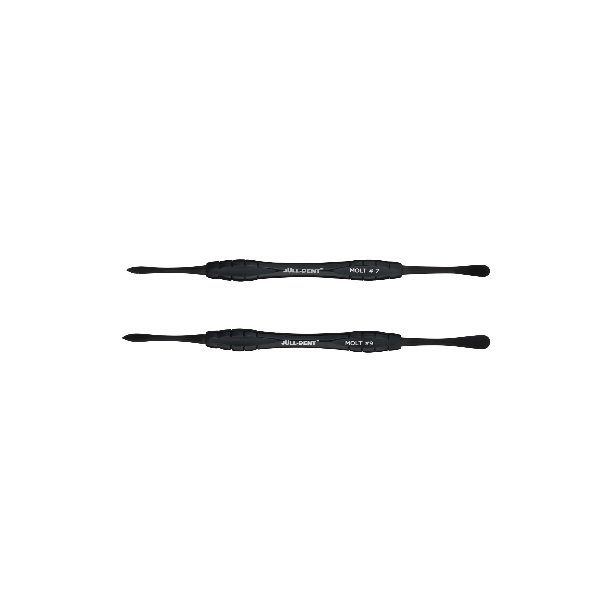 Jull-Dent 32C- Molt #9 Periosteal Large: Combines a large, curved blade that is 7.5 mm wide and has a rounded tip with a curved blade that is 3.5 mm wide and has a pointed tip. Both ends are non-cutting.