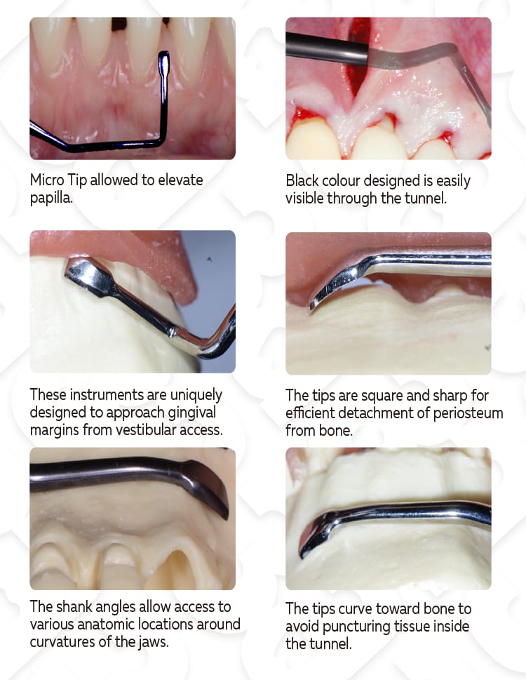- The elevators allow efficient tunnel elevation in the vestibular region, under gingival margins and under interproximal tissues.