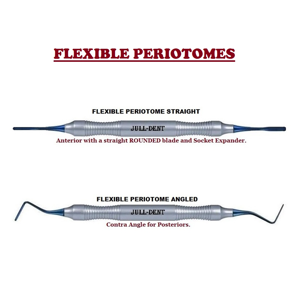 Periotomes are used for carefully detaching the marginal gums and the desmodontal fibres. The flexible tip helps tool to reach the apical area of the root and seperate it from the marginal gums.Dental periotomes sever periodontal ligamentsduring atraumatical tooth extraction. These instruments may also be used during routine extractions, though they are particularly important when extraction is followed by placement of dental implants.